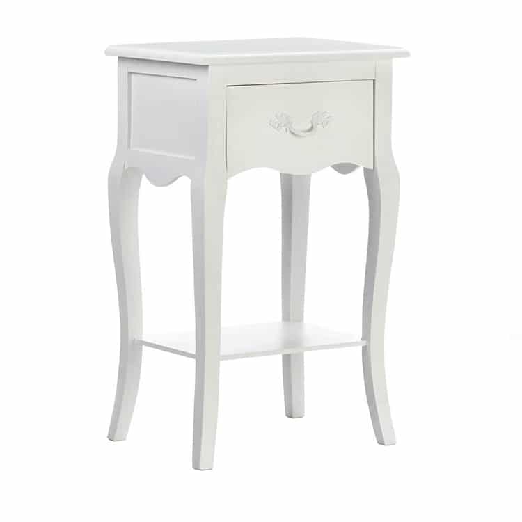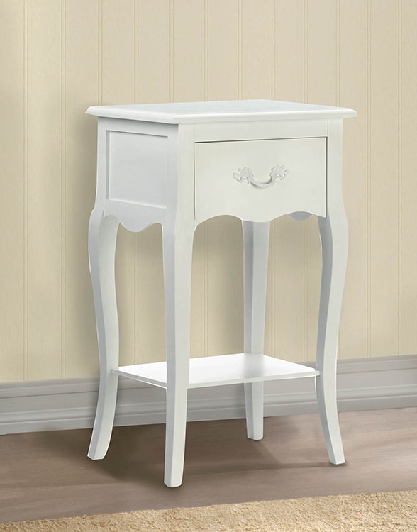 This romantic country nightstand fits nicely anywhere, whether it’s tucked next to your bed, or in the children’s room. The white finish makes a timeless addition to your space. Featuring one drawer and a lower open shelf, this table is perfect to display photo frames or store the TV remotes.